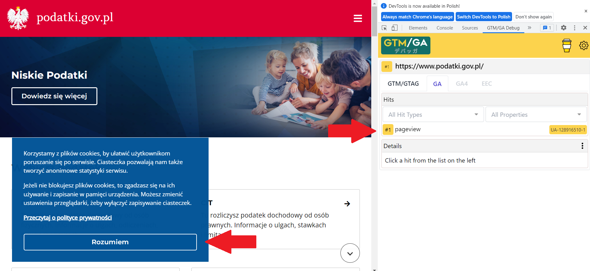 Należy również wspomnieć, że niestety większość serwisów w polskim Internecie nie ma wdrożonego śledzenia zgodnie z zaleceniami ustawy. Do tego grona należy również spora część stron rządowych. Przykładowo: na stronie podatki.gov.pl dane są wysyłane do Google Analytics, pomimo że polityka prywatności nie została zaakceptowana.