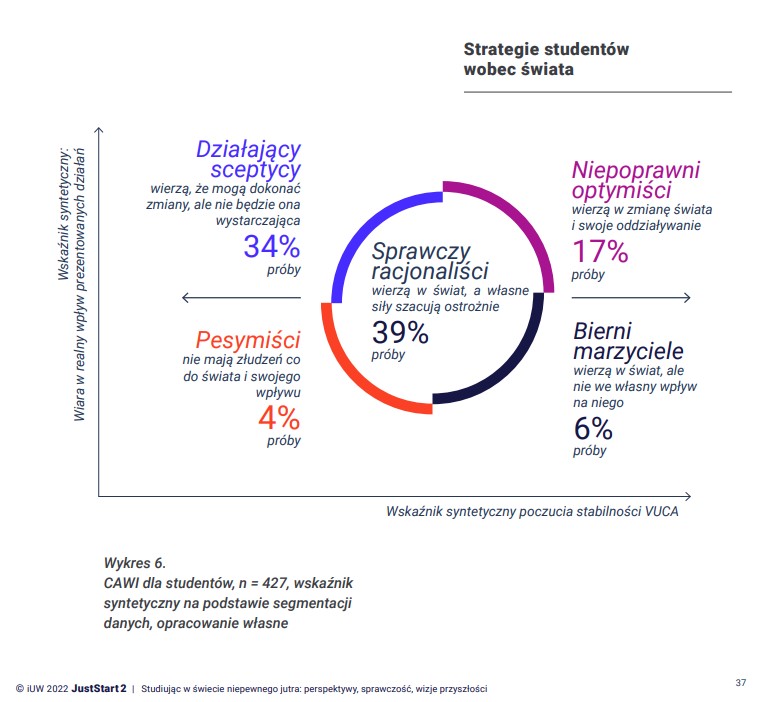 To zupełnie inna rzeczywistość od tej, w której dojrzewali millenialsi. Oni byli świadkami końcowego okresu wzrostu gospodarczego tzw. Globalnej Północy. Potwierdza to też wspomniany wcześniej raport. Według niego niemal 50% zetek łączy studia z pracą. Ponadto autorzy raportu przeanalizowali też strategie ankietowanych wobec świata. 39% z nich określono jako sprawczych racjonalistów, tj. wierzących w świat, ale szacujących swoje siły ostrożnie. Z kolei 34% to działający sceptycy, którzy wierzą, że mogą dokonać zmiany, ale niekoniecznie będzie ona wystarczająca. Wśród zetek nie ma zbyt wielu biernych marzycieli czy niepoprawnych optymistów.