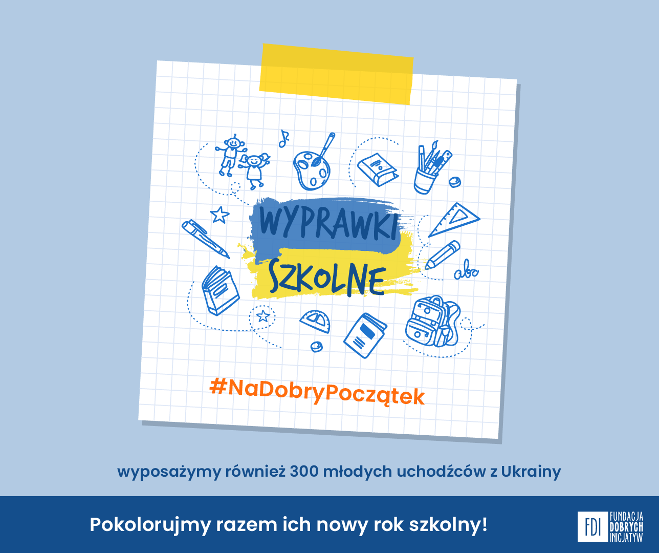 W tym roku, ze względu na zaangażowanie Fundacji we wsparcie dla Ukrainy poprzez program pomocowy #FDIaid akcja #NaDobryPoczątek służy też 300 młodym uchodźcom z Ukrainy, którzy Nowy Rok Szkolny 2022/2023 rozpoczną w Polsce. We współpracy z partnerskim Ośrodkiem Pomocy Społecznej Dzielnicy Ochota m.st. Warszawy Fundacja Dobrych Inicjatyw dociera z pomocą tam, gdzie jest ona najbardziej potrzebna.