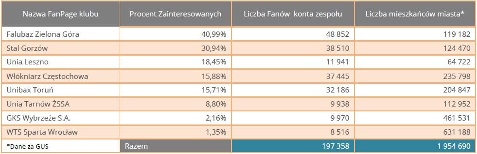 Procent zainteresowanych [PZ] – został obliczony na podstawie ilorazu liczby fanów konta zespołu przezliczbę mieszkańców miasta. Najwyższy [PZ] odnotowaliśmy podobnie jak w poprzednim rankingu dla konta Falubazu Zielona Góra. Oznacza to, że w porównaniu do liczby ludności Zielonej Góry konto Falubazu stanowi 40,99% wartości podawanej przez GUS. Stal Gorzów charakteryzuje się omawianym współczynnikiem na poziomie 30,94%. Oba wspomniane wyniki są stosunkowo wysokie i wskazują na dużą popularność drużyn w porównaniu do wielkości miast i możliwości pozyskiwania kibiców przez te zespoły.