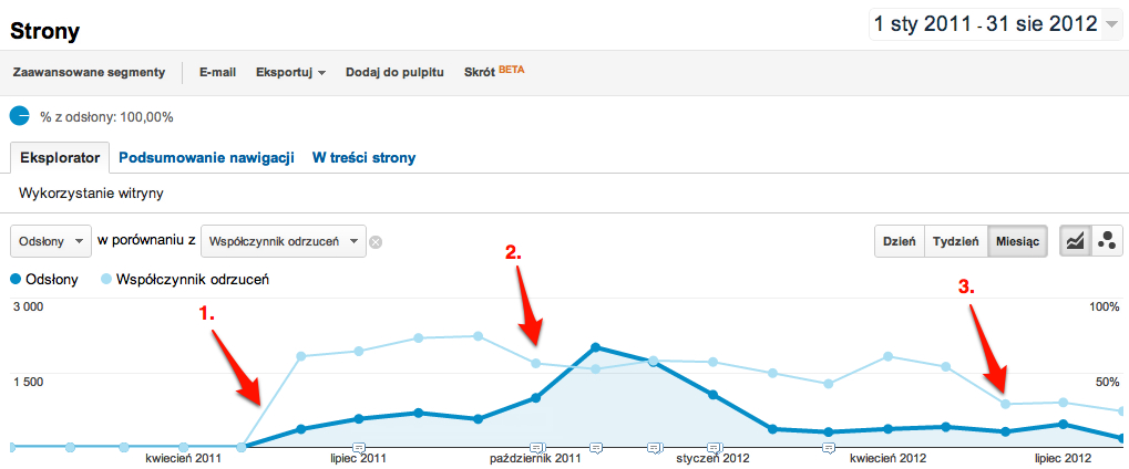 - W czerwcu 2011 zostało zaimplementowane śledzenie na stronach 404. Jak widzimy współczynnik odrzuceń (jasna niebieska linia) każdego miesiąca był powyżej 50%. Liczba odsłon (ciemna niebieska linia) jest stosunkowo wysoka, co pokazuje, że jest to wartościowa strona.