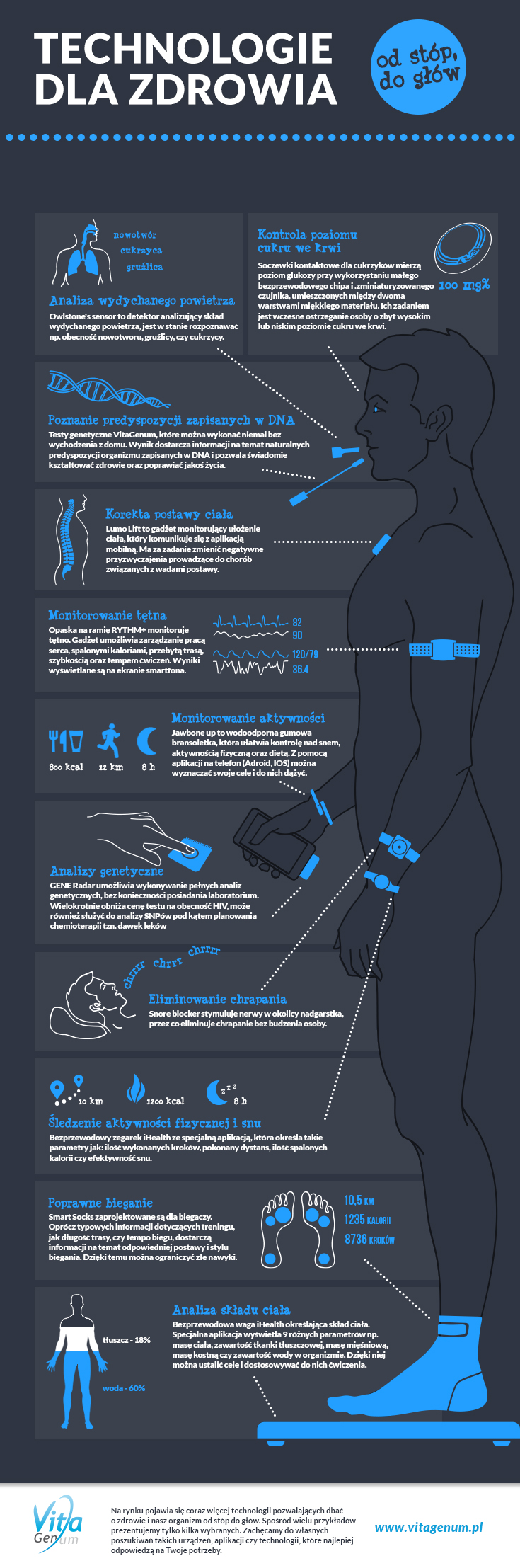 Technologia zaczyna wkraczać do każdej sfery naszego życia. Dzięki jej osiągnięciom możemy zadbać o zdrowie, dosłownie od stóp do głów. Soczewki kontaktowe dla cukrzyków, testy genetyczne VitaGenum wykonywane niemal bez wychodzenia z domu, Lumo Lift, RYTHM +, Jawobone up, Gene Radar, Snore Blocker, iHealth, Smart Socks – to tylko przykłady urządzeń i aplikacji, które mogą nas wspomagać w zachowaniu dobrej formy oraz kontrolowaniu organizmu.