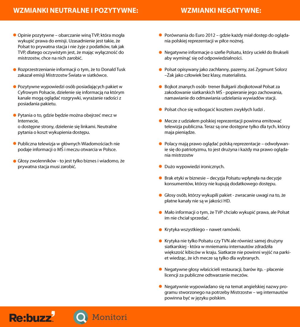Analizie zostały poddane wpisy opublikowane w okresie 20.08.2014-18.09.2014. Analizowanymi typami kanałów, wokół których pojawiało się zainteresowanie, były: blogi, fora internetowe, Twitter, Facebook, portale informacyjne (komentarze pod artykułami), serwisy wideo oraz Instagram. Przeanalizowane zostały wpisy pochodzące od użytkowników (próba analityczna) oraz pozostałe posty. W centrum zainteresowania znalazły się wzmianki, w których internauci wypowiadali się w kontekście decyzji Polsatu na temat zakodowania Mistrzostw Świata .Przeanalizowano 1000 losowo wybranych wpisów, które pojawiły się po wprowadzeniu wymienionych słów kluczowych do systemu Monitori. Stanowiły one próbę analityczną.