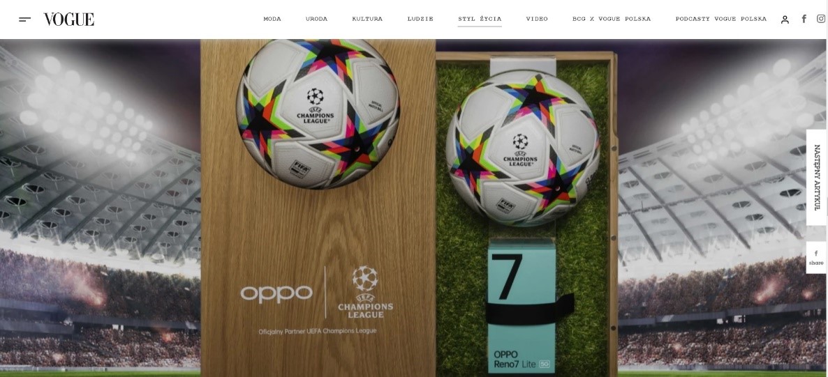 Kolejnym działaniem, poprzez które OPPO chciało dotrzeć do fanów sportu i nowych technologii były konkursy, zarówno we vlogosferze, jak i w zróżnicowanych mediach – sportowych, technologiczny i lifestyle’owych. Na łamach redakcji m.in. Meczyki.pl, Weszlo.com czy Technostrefa.com do wygrania był limitowany Box zawierający oficjalną piłę meczową Ligi Mistrzów UEFA oraz smartfon Reno7 Lite 5G. Konkurs odbył się również w Vogue.pl, a OPPO jako pierwsza marka w Polsce wykorzystała nowy format online na stronie internetowej magazynu.