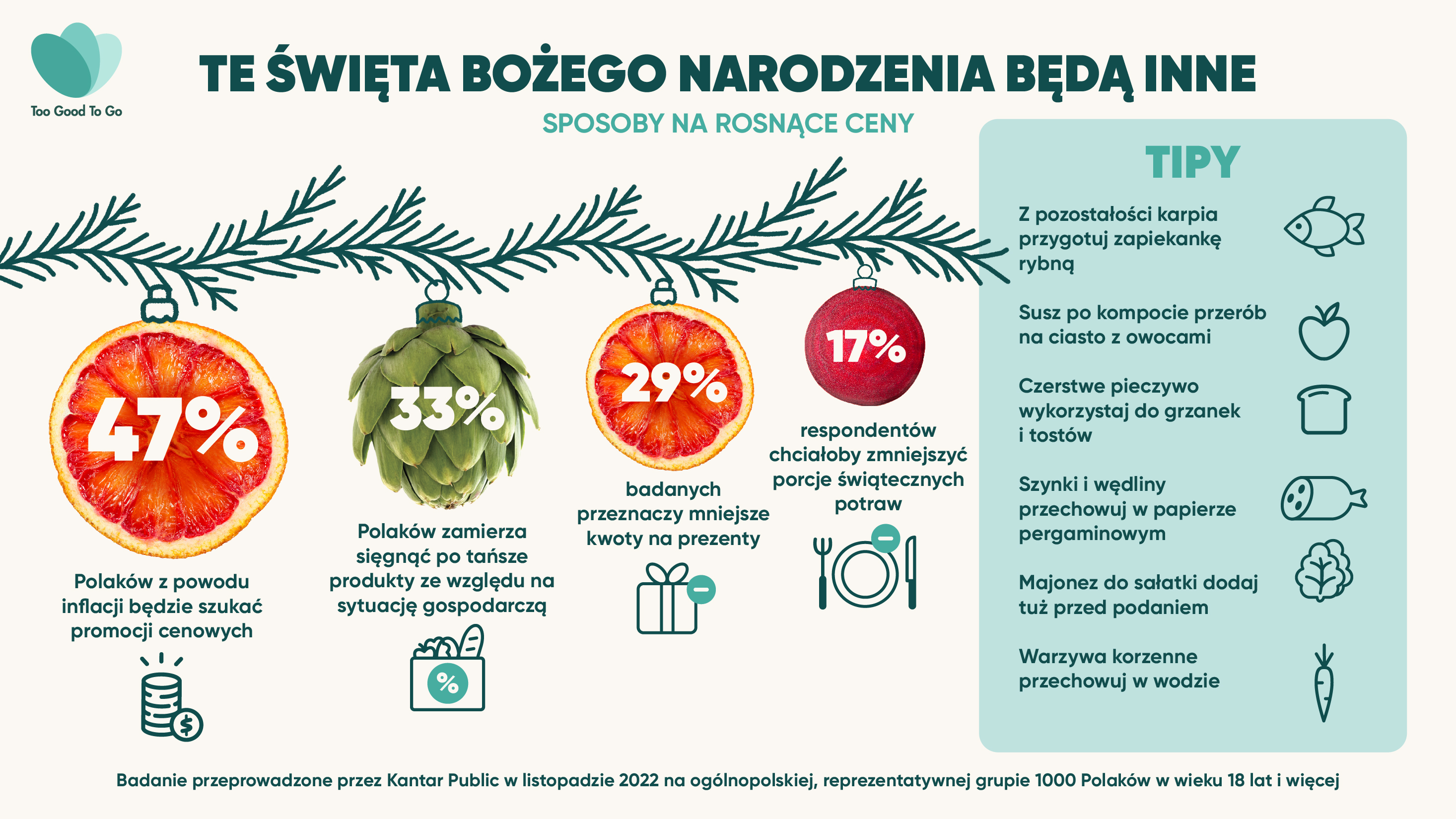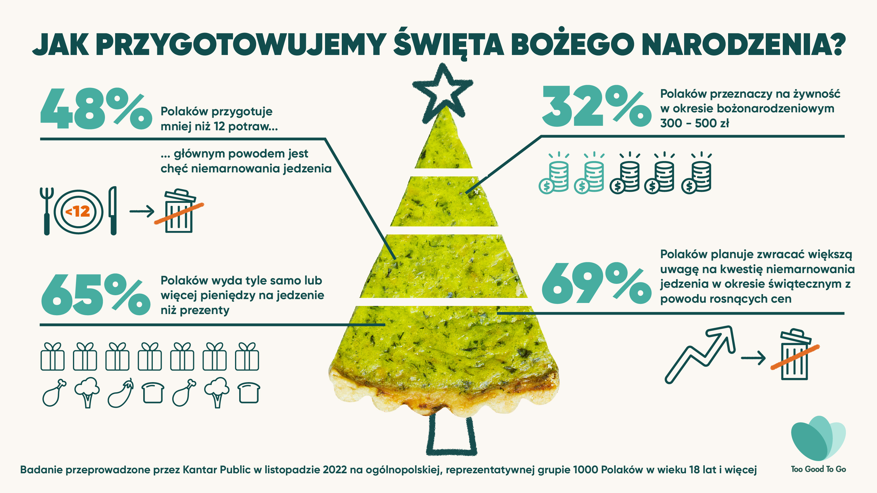 Najnowszy szybki odczyt inflacji pokazał, że w listopadzie jedzenie podrożało o 22,3%. W jaki sposób wysokie ceny odcisną się na przygotowaniach bożonarodzeniowych? Wyniki raportu Kantar Public dla Too Good To Go pokazują, że prawie dla wszystkich badanych (93%) tegoroczne święta będą inne niż w poprzednich latach. W wielu polskich domach kolacja wigilijna liczyć będzie mniej niż 12 potraw – aż 49% ankietowanych rozważa rezygnację z przygotowania jednej lub więcej świątecznych potraw.