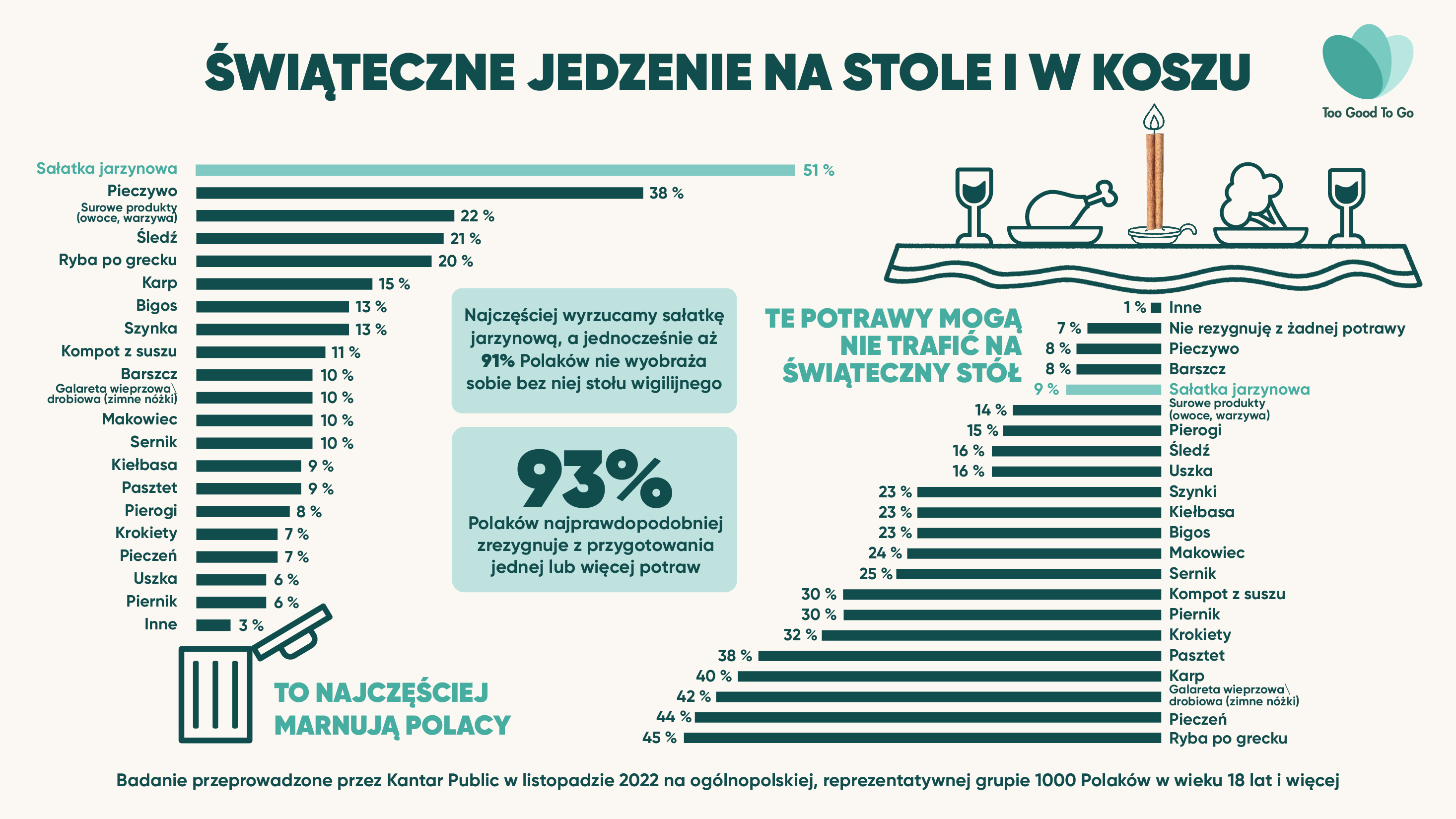 Tegoroczne święta w dobie wysokiej inflacji będą najskromniejsze od lat. Prawie połowa Polaków deklaruje, że przygotuje mniej niż 12 potraw na wigilijny stół, a w pierwszej kolejności rozważa rezygnację z ryby po grecku (45%). Mimo że w trudnych czasach jedzenie jest cennym „prezentem”, to jednocześnie wciąż wyrzucamy żywność – potwierdziło to 39% Polaków. Co i dlaczego marnujemy postanowiło zbadać Too Good To Go we współpracy z Kantar Public.