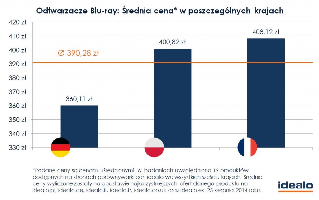 … Francji i w Wielkiej Brytanii. Najwyższą średnią cenę odtwarzacza Blu-ray znaleźć można na francuskiej stronie porównywarki cen idealo. Jest ona o 17,48 zł (5 proc.) wyższa od europejskiej ceny średniej. Najwięcej, bo aż połowa ofert, jest natomiast najdroższa w Wielkiej Brytanii. Łącznie jednak średnia brytyjska cena odtwarzaczy Blu-ray jest wciąż niższa od francuskiej.