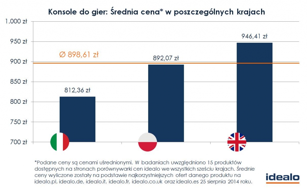 … Włoszech. Średnia cen konsoli do gier w tym kraju jest najniższa, przy czym w najniższej cenie oferowanych jest aż 11 z 15 zbadanych modeli. Średnia cena we włoskich sklepach internetowych jest o 86,23 zł (10 proc.) niższa od europejskiej średniej ceny w wysokości 898,61 zł.