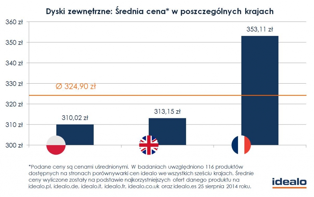 Najtańszy dysk zewnętrzny Lacie Porsche Design Desktop Drive P9230 o pojemności 2TB na stronie idealo.pl oferowany jest w cenie 381,01 zł. Użytkownicy francuskiej strony porównywarki idealo muszą zapłacić za niego aż o 123,20 zł (25 proc.) więcej – najkorzystniejsza oferta tego produktu kosztuje 504,21 zł. Średnia cena dysku zewnętrznego wynosi natomiast 431,52 zł (stan: 29.08.2014, godz. 14:09).