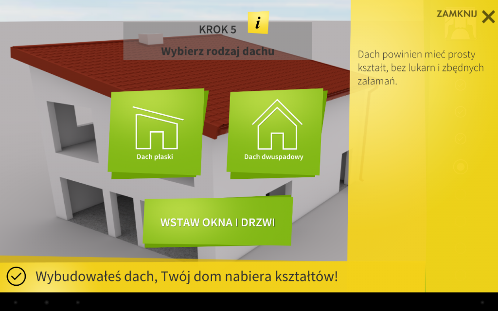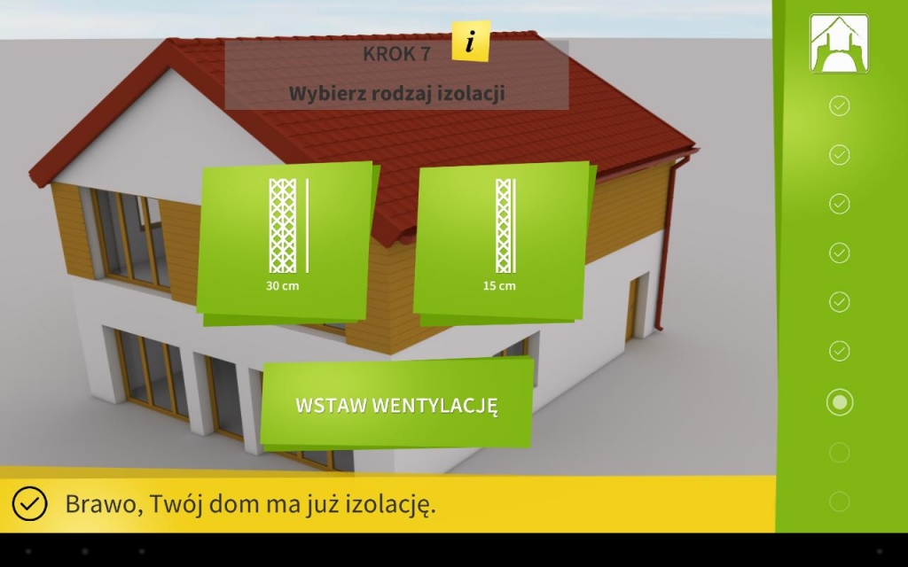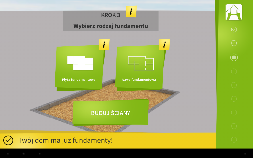 Aplikacja krok po kroku, od wyboru fundamentów do instalacji systemu wentylacyjnego, przeprowadza użytkownika przez poszczególne etapy budowy domu. Każdy kolejny etap „budowy” jest uzupełniony o informacje merytoryczne na temat technologii i konstrukcji domów energooszczędnych i pasywnych. Wspomniane wskazówki można przeczytać, klikając w ikonkę „i”.