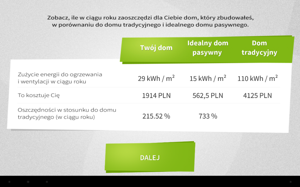 Po zakończeniu projektu użytkownik dowie się, ile energii do ogrzewania i wentylacji zużyje rocznie jego nowy dom oraz ile będzie za to musiał zapłacić. Porówna też wysokość oszczędności na rachunkach – w odniesieniu do domu konwencjonalnego.