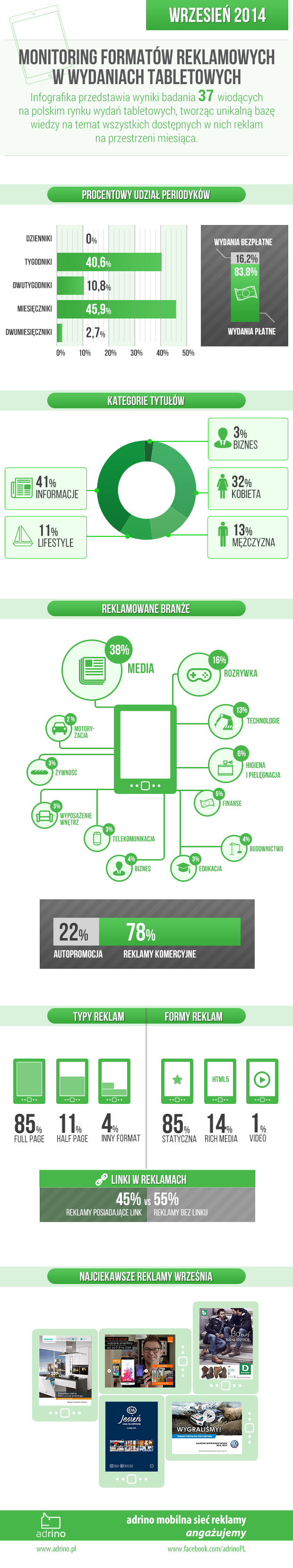 Jeśli chodzi o typ reklam, to Full Page zwiększył przewagę nad pozostałymi reklamami – we wrześniu prawie 85 proc. reklam zajmowało całą stronę. Tzw. „inne formaty”, charakterystyczne dla przedruków z prasy, występowały o ponad 50 proc. rzadziej – obecnie stanowią one jedynie niewiele ponad 4 proc. wszystkich formatów. Pozostałe 11 proc. zajmują half-page’e.