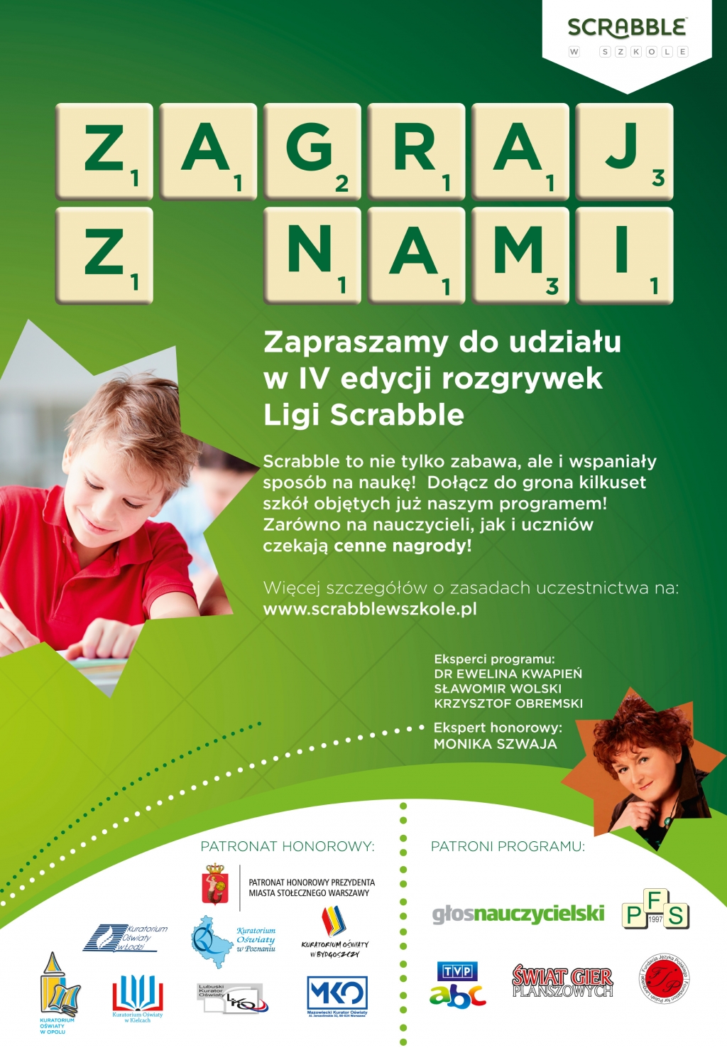 „Scrabble® w szkole” to program edukacyjny skierowany do nauczycieli i uczniów szkół podstawowych, gimnazjów i szkół ponadgimnazjalnych w całej Polsce. Celem akcji jest promocja gry w Scrabble® jako doskonałego narzędzia pomocniczego w nauczaniu. To świetny sposób na urozmaicenie lekcji, zajęć świetlicowych czy bibliotecznych. Gra w Scrabble®poprzez intensywny trening skojarzeń, wykorzystywanie logicznego myśleniawspomaga rozwój intelektualny i solidnie trenuje pamięć. Poprzez liczne powtórzenia i częstą odmianę słów uczniom grającym w Scrabble® łatwiej przyswaja sięortografia i gramatyka języka polskiego. Scrabble®wymagają pracy ze słownikiem, co także poszerza wiedzę ogólną o polszczyźnie. Gra wzbudza u graczy naturalne zainteresowanie językiem oraz zasadami gramatyki, wzbogaca pojemność zasobów słów. Scrabble ucząpodejmowania strategicznych decyzji, radzenia sobie ze stresem, kiedy przeciwnik ma przewagę i należy jak najszybciej nadrobić stratę… i poza tym są świetną zabawą!Każdy, kto lubi rozwijać swój zasób słownictwa i rywalizację, jest idealnym kandydatem do szkolnego kółka Scrabble®. Wedle nauczycieli ta gra ma ogromny potencjał edukacyjny a uczestnictwo w programie pozwala go w pełni wykorzystać w stymulowaniu rozwojuuczniów. Od lat zarówno młodzież, jak i nauczyciele angażują się w scrabblowe przedsięwzięcia w szkołach, na świetlicach czy w bibliotekach. Biorą udział w konkursach, rozgrywają kolejne partie Scrabble®, sami wymyślają sposoby, w jakie można wykorzystać grę, prześcigając się w coraz to ciekawszych pomysłach. W ramach projektu organizowane są także turnieje, podczas których młodzi scrabbliści z całej Polski mogą sprawdzić swoje umiejętności. Zawsze towarzyszy im doskonała zabawa i atmosfera zdrowej rywalizacji.Wszystkich, którzy chcieliby sprawdzić swoje umiejętności zapraszamy już dzisiaj na Mikołajkowy Turniej Scrabble® w grudniu 2014 w Warszawie (więcej szczegółów wkrótce).