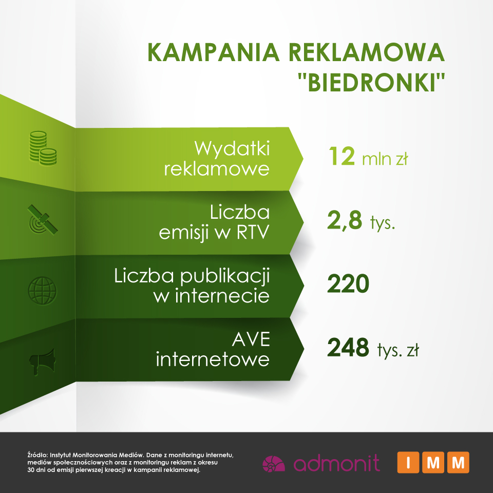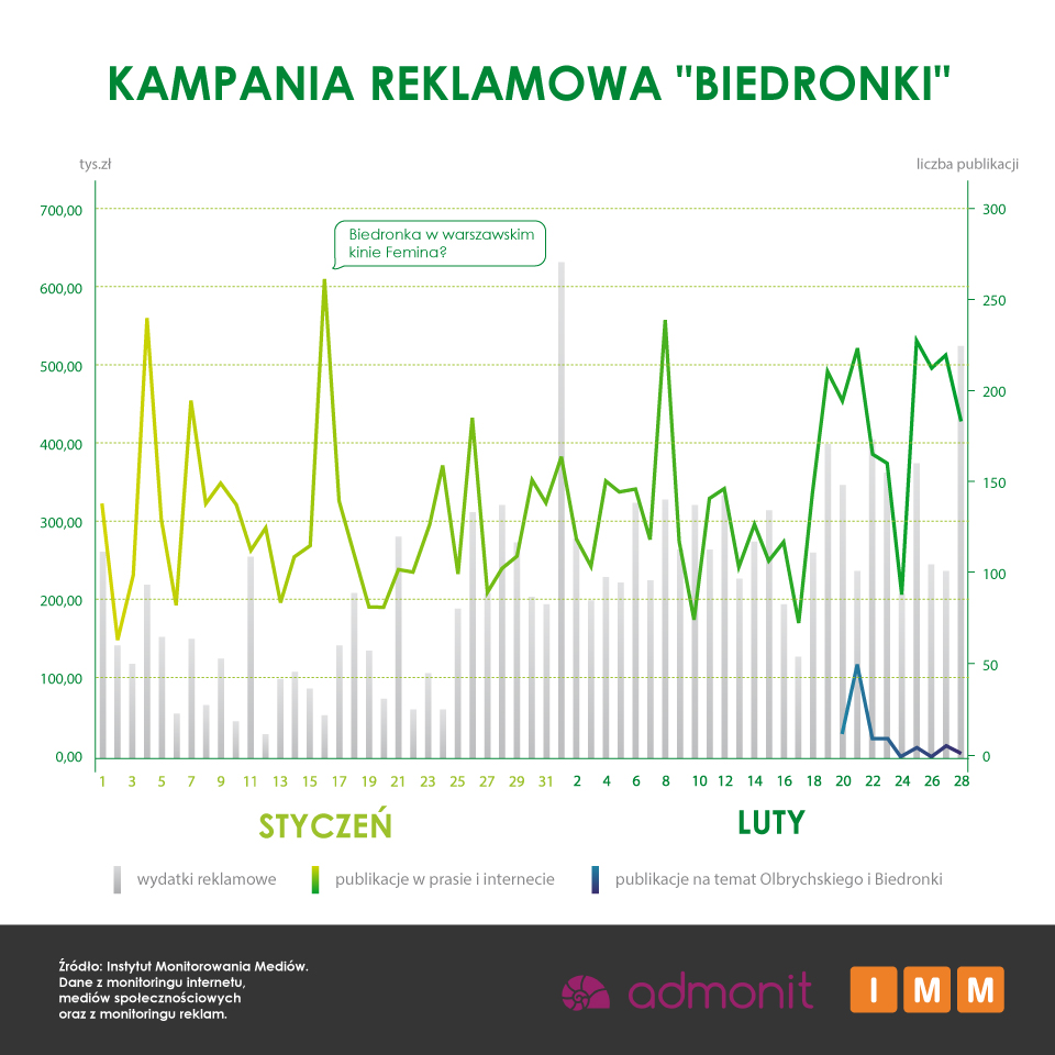 Co ciekawe, kampania, która ruszyła 21 lutego 2013 roku nie wiązała się ze znacznym wzrostem popularności w mediach. Wystarczy porównanie popularności dyskontu w mediach z dwóch miesięcy – najwięcej publikacji wygenerowały informacje o planie utworzenia Biedronki w warszawskim kinie Femina. Przez wielu internautów zostało to uznane za „zamach na świętość” – podobny wydźwięk miały komentarze na temat zaangażowania Daniela Olbrychskiego w promocję dyskontu. Wzmianki o kampanii to jedynie ułamek publikacji w kontekście rozmów o marce.