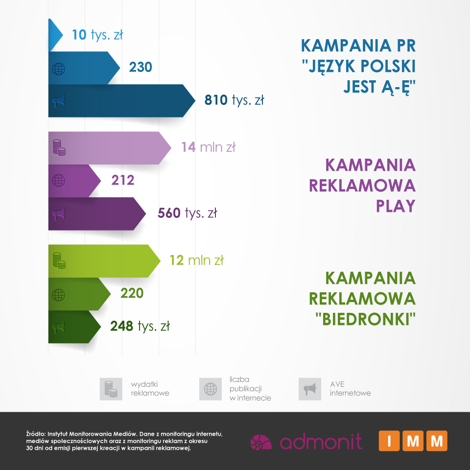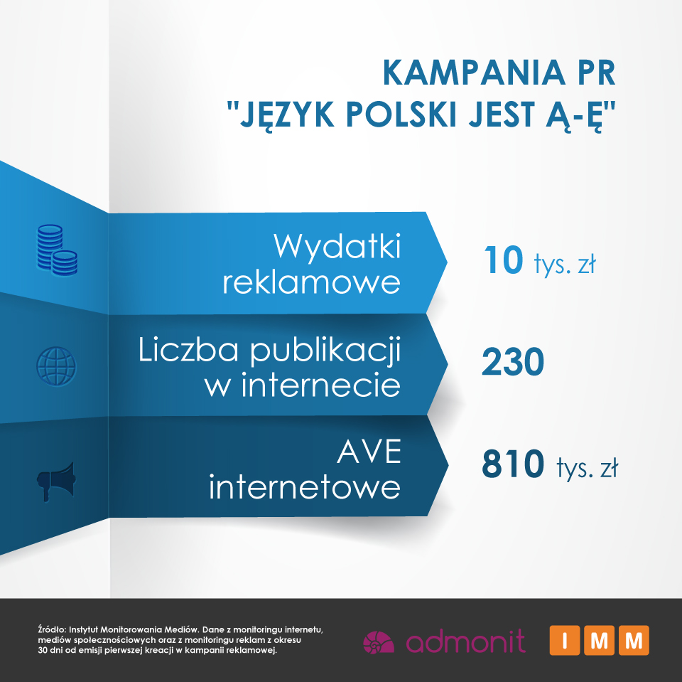 Jak wynika z badań reakcji internautów na nowe kampanie promocyjne, stosując reklamę tradycyjną, odbiorców coraz trudniej zaskoczyć i wywołać wśród nich dyskusję. Konsumenci mediów – nie tylko internauci – szybko przechodzą do porządku dziennego nad kampaniami „oczywistymi”: są przyzwyczajeni do faktu, że reklamodawcy wykorzystują znane twarze, że nie oszczędzają na skali kampanii. W celu porównania skali skutku, w tym przypadku internetowego oddźwięku, kampanii reklamowych z kampaniami, których głównym narzędziem był PR, sprawdziliśmy popularność kampanii „Język polski jest ą-ę”, która odbywała się w tym samym czasie, co kampania P4 oraz Jeronimo- Martins.