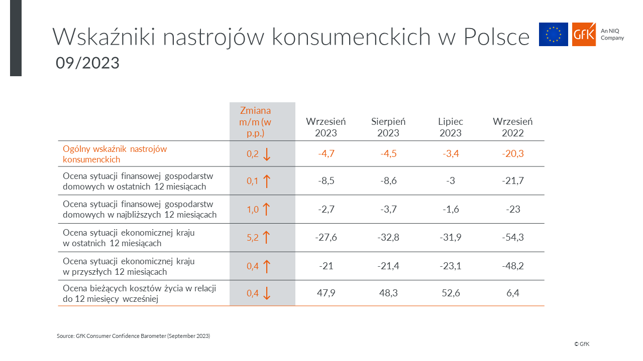 Barometr Nastrojów Konsumenckich GfK, czyli syntetyczny wskaźnik ilustrujący aktualne nastroje Polaków w zakresie postaw konsumenckich, we wrześniu 2023 r. wyniósł -4,7, co oznacza spadek o 0,2 jednostki w stosunku do poprzedniego miesiąca.
