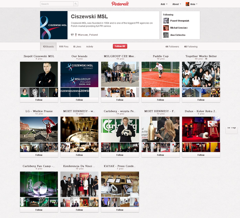 Na Pintereście można znaleźć wiele stron polskich firm związanych z marketingiem, branżą reklamową, PR i social media. Najwięcej osób obserwuje profile: PRovoke (289), {thinkBIG} (243), faceADDICTED Agency (183) i Harmonique PR (165).