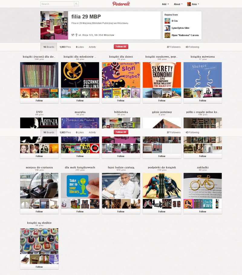 Spośród serwisów związanych z czytaniem na Pintereście najbardziej aktywne są: Booklikes (165 followersów), Książki TV,  Księgarnia Kumiko.pl i Filia nr 29 Miejskiej Biblioteki Publicznej we Wrocławiu.