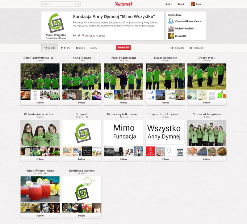 Najaktywniejsze fundacje, kluby, inicjatywy, związki i stowarzyszenia obecne na Pintereście to: Modraszek Kolektyw (153 obserwujących), Klub Miłośników Czystego ObuwiaCHI PolskaFundacja Anny Dymnej „Mimo Wszystko”Fundacja Rozwoju Społeczeństwa Informacyjnego oraz Ruszmy Szczecin.