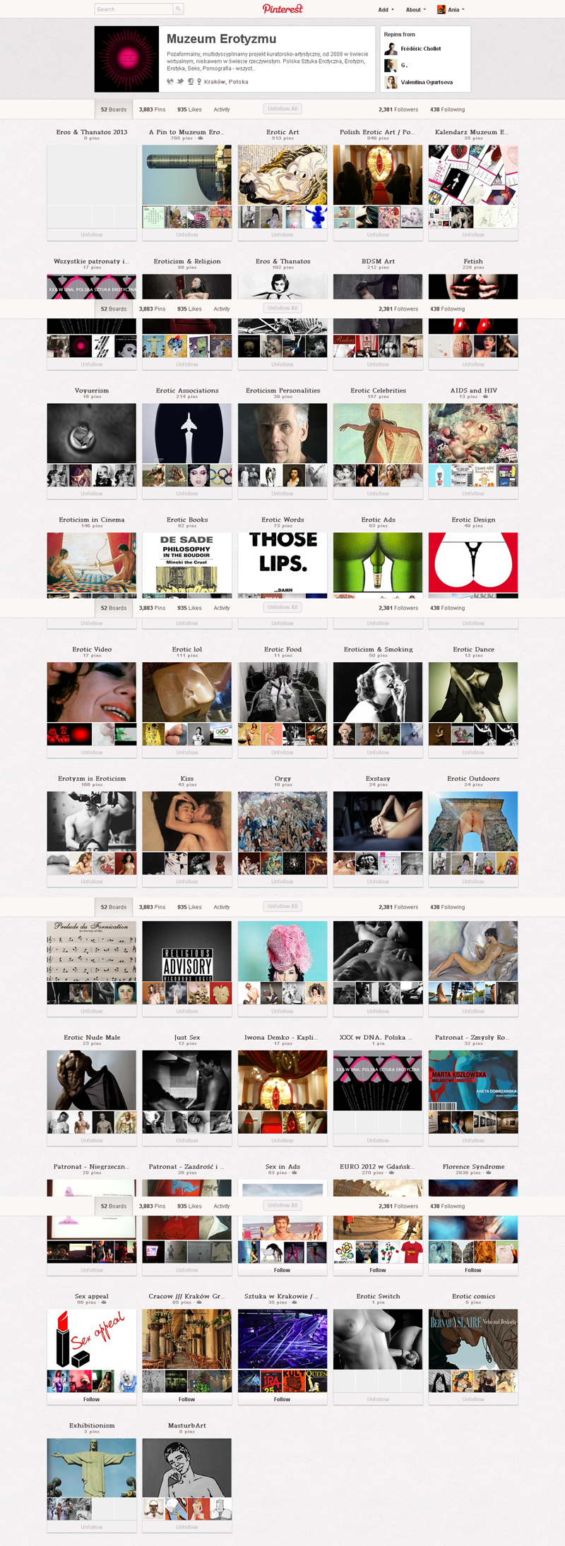 Najpopularniejszym polskim kontem na Pintereście jest Muzeum Erotyzmu, którego aktywność śledzi prawie 2400 osób. Swoją działalność kulturalno-rozrywkową starają się promować w tym serwisie także Teatr OchotyTeatr Łaźnia Nowa i Salsa Libre.