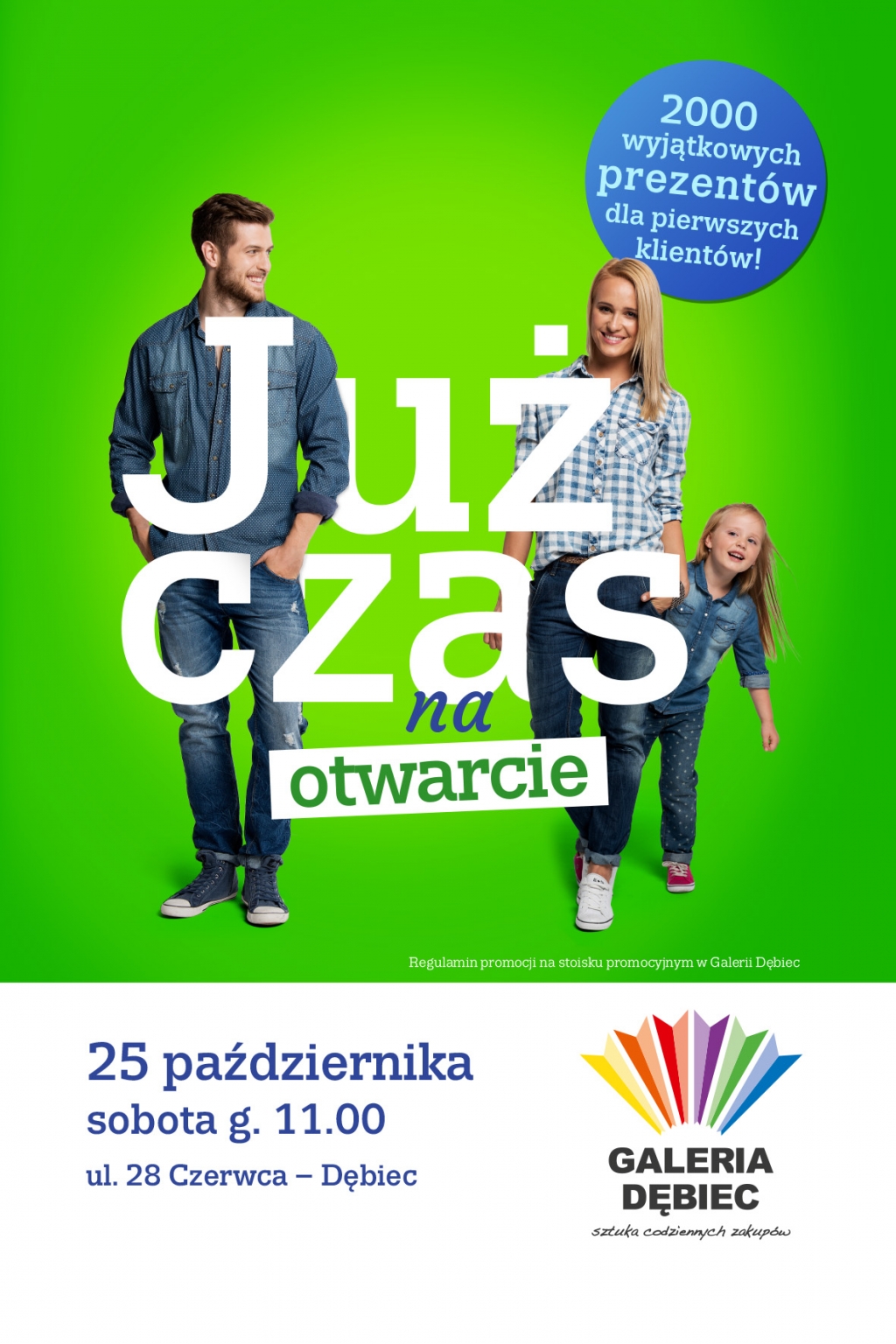 W przypadku najnowszej kampanii, hasło przewodnie to: „Już czas na otwarcie”, przy którym w ciekawych, niewymuszonych pozach występują modele kampanii – elegancka kobieta, mężczyzna w stylu sportowym i szczęśliwa, młoda rodzina, czyli zwykli ludzie, którzy reprezentują szeroką grupę docelową Galerii Dębiec. Kolorystyka kreacji, pojawiającej się w trzech różnych odsłonach, nawiązuje do intensywnych barw widniejących w logo Galerii.