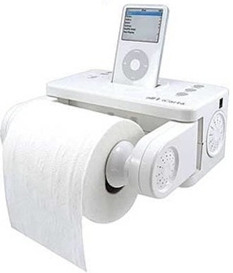 Czy myślałeś kiedyś, jak uatrakcyjnić swoje pobyty w toalecie? Oczywiście najbardziej klasyczną metodą jest czytanie gazet lub rozwiązywanie krzyżówek panoramicznych, jednak akcesorium iCarta, produkcji Atech Flash Technology, łączące w sobie podajnik na papier toaletowy oraz stację dokującą dla iPhone’a oraz iPoda, z pewnością stawia zasadność wspomnianych rozrywek pod dużym znakiem zapytania. Wbudowane tam głośniki stereo pozwalają cieszyć się ulubionymi składankami muzycznymi w każdej wolnej chwili – niestety nadmierny hałas panujący wokół lub duża kubatura pomieszczenia może spowodować, iż ich znikoma moc okaże się mało satysfakcjonująca dla potencjalnego użytkownika. Ci, którzy nie potrafią się rozstać ze swoim technologicznym cudem, nie powinni jednak szczególnie mocno narzekać. Cena: 60 dolarów. Oryginalność musi w końcu kosztować.