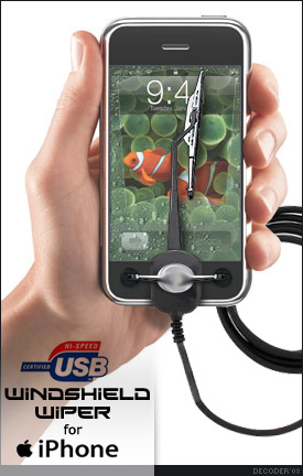 Jak w prosty sposób pozbyć się smug lub kropli deszczu z ekranu ulubionego iPhone’a? Przetrzeć go ręką lub chusteczką? Nie! Wystarczy zamontować pod ekranem specjalny moduł, wyposażony w niewielką wycieraczkę (w istocie miniaturę samochodowej), która skutecznie oczyści szklaną powierzchnię z wszelkich zabrudzeń. Zasilanie? USB, choć w internecie pojawiają się również pokrewne koncepcje, przewidujące możliwość zasilania bateryjnego. Jakkolwiek nie jest wiadomym, czy projekt należy traktować w kategoriach realnej propozycji rynkowej – pomimo licznych plotek, brak jakichkolwiek szczegółów technicznych bądź wskazania ceny. Mimo wszystko – brawa za inwencję bezsprzecznie się należą.