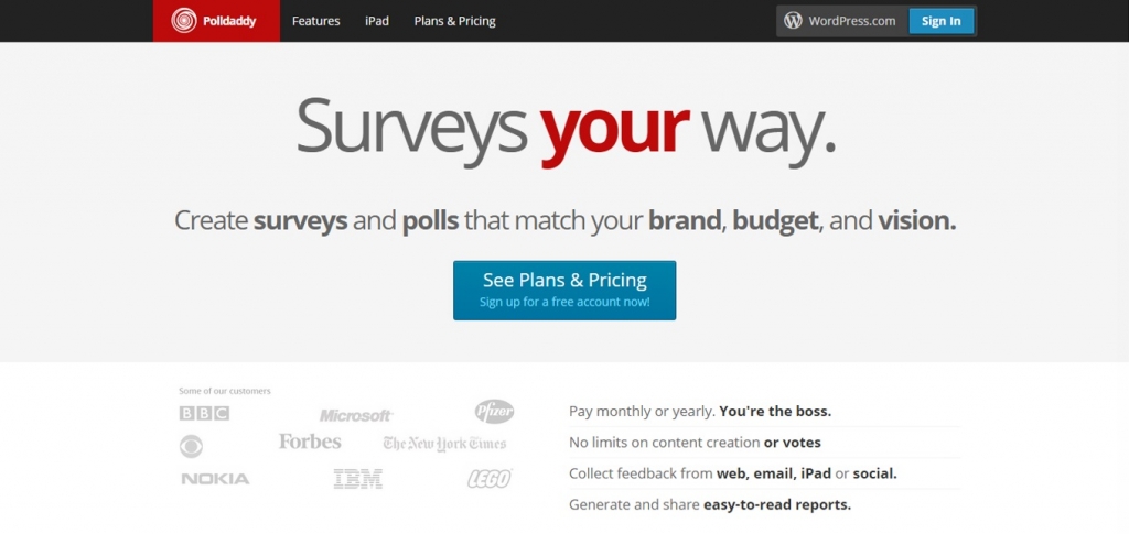Polldaddy oferuje widgety z ankietami dla blogów, stron internetowych. Zaawansowane filtry pozwalają szybko przekuć dane w informacje. Odpowiedzi można zbierać za pośrednictwem strony internetowej, e-mail lub social media. Rozwiązanie jest znane i preferowane ze względu na swoją prostę i krótki czas przygotowania ankiet.