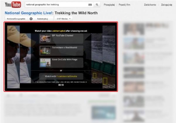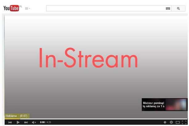 W ramach kanału In-Stream reklamy wyświetlane są na początku odtwarzanego przez potencjalnego klienta klipu. Tutaj należy pamiętać, że reklama nie powinna być dłuższa niż 30 sekund. Oczywiście możemy dodać przekaz trwający 60 sekund, ale w ramach działań In-stream zostanie on „ucięty” po 30 sekundach wyświetlania. Kolejnym czynnikiem przemawiającym za dodawaniem przekazów o określonym czasie są wyniki badań wskazujące, że aby odpowiednio zainteresować widza swoim przekazem wystarczy 30 sekundowy klip składający się z krótkiego, chwytliwego wstępu, rozwinięcia (core przekazu reklamowego) oraz zakończenia, będącego podsumowaniem reklamy. Użytkownik, któremu zostaje wyświetlony przekaz w In-Stream ma możliwość pominięcia go po 5 sekundach emisji. Większość osób w tym momencie może sobie zadać pytanie – po co wydawać pieniądze na reklamę, którą każdy może pominąć? Oczywiście takie rozumowanie nie jest błędne i Google zdawało sobie sprawę, że odsetek osób które w ten sposób postawią sprawę będzie bardzo duży, co finalnie może przełożyć się na brak zainteresowania reklamami w YouTube. Dlatego system płatności za obejrzenie reklamy skonstruowany został tak, że płacimy tylko i wyłącznie za efekt, czyli obejrzenie całego przekazu, który jest rozliczanym w modelu CPV (cost per view).
