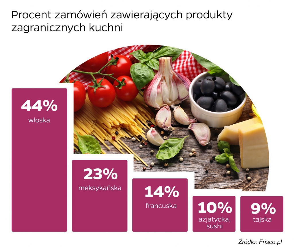 Według analizy przeprowadzonej przez Frisco.pl amatorzy kuchni włoskiej zamawiali najchętniej mozzarellę, suszone pomidory, sos pesto genovese, a także znane włoskie sery takie jak choćby ricotta czy gorgonzola. Do koszyków osób preferujących produkty typowe dla kuchni meksykańskiej najczęściej trafiały awokado, pikantne papryczki pepperoni, pszenne wrapy, kukurydziane chipsy tortilla oraz chrupiące muszle taco. Wśród miłośników kuchni francuskiej natomiast największą popularnością cieszyły się przede wszystkim sery –Gruyere, Emmentaler i Comte, ale też solone masło. W przypadku kuchni azjatyckiej najchętniej zamawiane były makaron udon oraz składniki wykorzystywane do sushi – sos sojowy, ryż i marynowany imbir. Jeśli zaś chodzi o kuchnię tajską – prym wiodła pochodząca stamtąd odmiana sosu sojowego, a za nią uplasowały się mleko kokosowe oraz papier i makaron ryżowy.