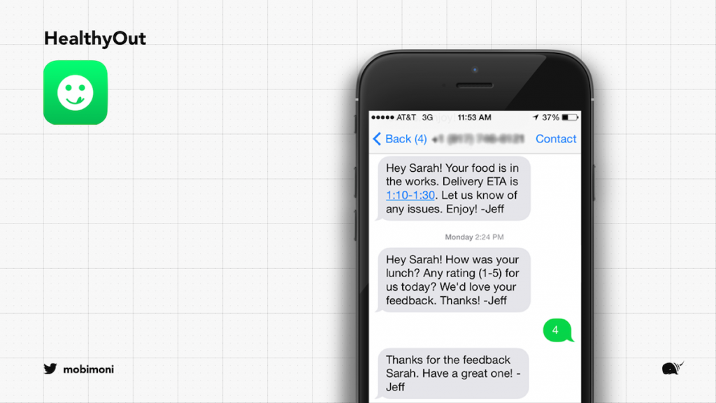 Inną dobrą praktykę pokazuje również amerykański Healthy Out. Jest to usługa zamawiania zdrowego jedzenia z dostawą do domu. Głównym kanałem komunikacji Healthy Out z klientami są SMS-y. Najpierw więc użytkownik dostaje SMS-a z informacją, o której godzinie może spodziewać się dostawy. Godzinę po dostawie dostaje kolejnego SMS-a z pytaniem, jak smakował mu posiłek. Wymagana odpowiedź to cyfra ze skali 1-5. Tylko tyle i aż tyle. Czy często jesz z telefonem pod ręką? Zobacz zatem, jak wysokie jest prawdopodobieństwo, że moment, który wybiera Healthy Out na zaangażowanie użytkownika, jest bardzo trafiony.