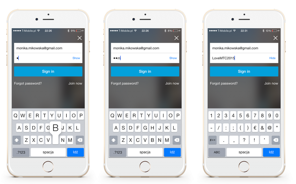 Wróćmy jeszcze do samego momentu wprowadzania danych do logowania. Dziś głowimy się nad tym, jak jeszcze bardziej ułatwiać je użytkownikom. Kiedyś innowacją było dodanie opcji “show password” przy polu do podawania hasła, które domyślnie jest maskowane. A gdyby domyślnie wpisywane znaki NIE były maskowane? Tę drobną innowację rekomenduje m.in. Luke Wróblewski, światowy autorytet ds. mobile UI/ UX. Z racji tego, że znak wybrany z klawiatury nie znika od razu z ekranu, tylko najpierw powiększa się, a następnie pozostaje jeszcze wyświetlony przez sekundę, to i tak nie jesteśmy w stanie dobrze ukryć wprowadzanego hasła. Po co więc uprawiać ‘sztukę dla sztuki’, zwłaszcza, gdy wielu użytkowników woli widzieć wpisywane znaki i mając możliwość „Show password” będzie z niej korzystać. Rekomendacja Luke’a oszczędza nam więc jedno tapnięcie. Z kolei dla tych wyjątkowo uwrażliwionych użytkowników dodatkowe tapnięcie w “Hide password” nie powinno stanowić problemu.