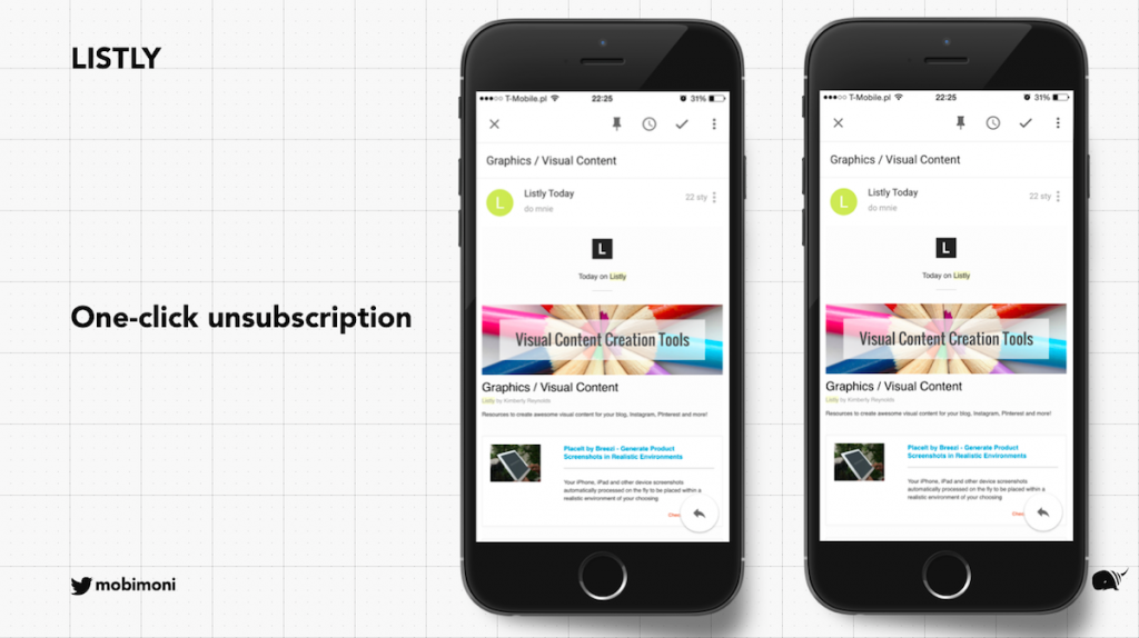 Dobrą praktykę realizuje serwis Listly, który wysyła newslettery z opcją “One-click unsubcription”. Nie chcesz otrzymywać od nich więcej wiadomości? Po prostu kliknij w/w opcję i sprawę masz z głowy. Żadnych problemów, żadnych zbędnych pytań (“Dlaczego nie chcesz już otrzymywać naszego newslettera?” / “A czy, aby na pewno jesteś pewny?” / “Przykro nam, że odchodzisz, może więc zmienisz jeszcze zdanie?” itp. itd.)