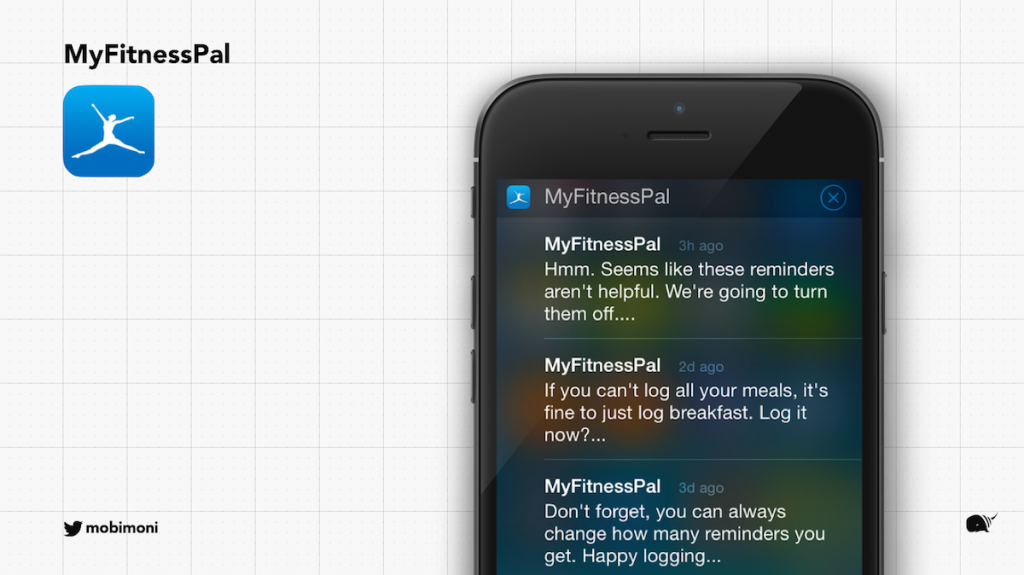 Bywa, że notyfikacje push wyskakują tym częściej, im rzadziej zaglądamy do aplikacji. Uczmy się zatem od MyFitnessPal, który szanuje brak zainteresowania ze strony użytkownika i po 3 push’ach bez reakcji ze strony użytkownika, po prostu odpuszcza.