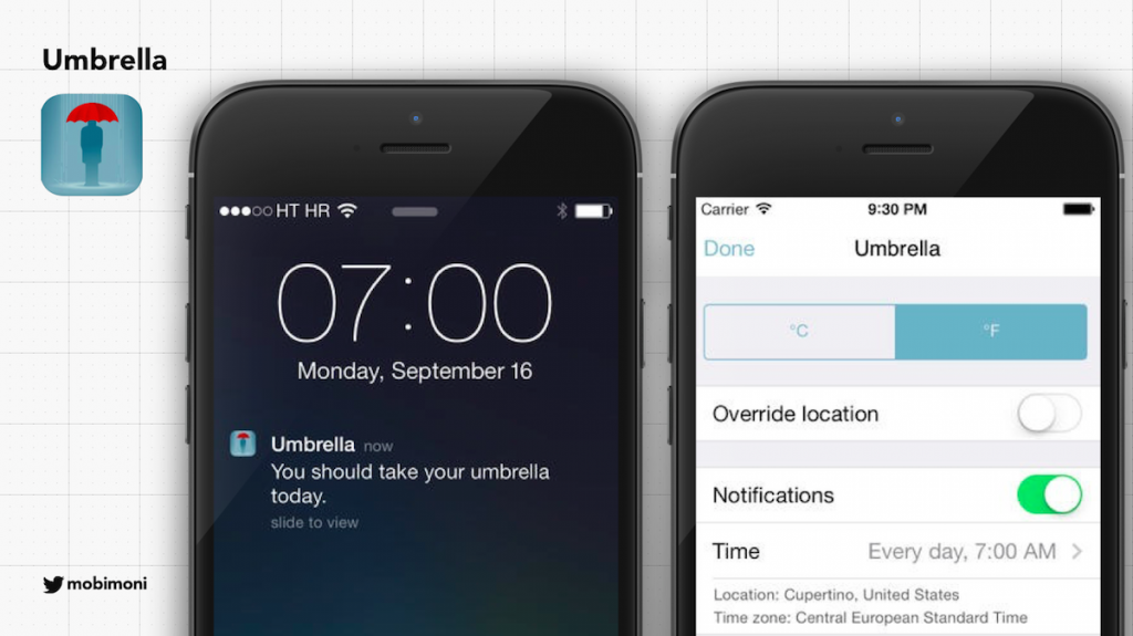 Plus dla aplikacji Umbrella, której nawet nie muszę otwierać, aby sprawdzić, czy będzie dzisiaj padać. W ustawieniach aplikacji ustalam, że chcę dostawać codziennie, np. o 7 rano powiadomienia push z odpowiedzią na to pytanie.