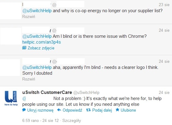 Na uwagę zasługuje też inna brytjska firma – uSwitch, która działa nie tylko w branży energetycznej, ale świadczy również usługi w obszarze telekomunikacji i finansów. uSwitch posiada aż trzy kanały na Twitterze, przez które komunikuje się z klientami Podobnie jak British Gas. Kanał skierowany do klientów, za pomocą którego w bardzo otwarty i przyjazny sposób utrzymuje kontakt z klientami. Dla przykładu: zawsze informuje kiedy konsultanci są dostępni i mogą pomóc rozwiązać problem czy udzielić rady. Przedstwiają również imię konsultanta, który aktualnie odpowiada. Takie zachowania w social media sprawiają, że klient rozmawia nie tylko z firmą, ale i z konkretnym człowiekiem, który pomoże rozwiązać powstały problem.