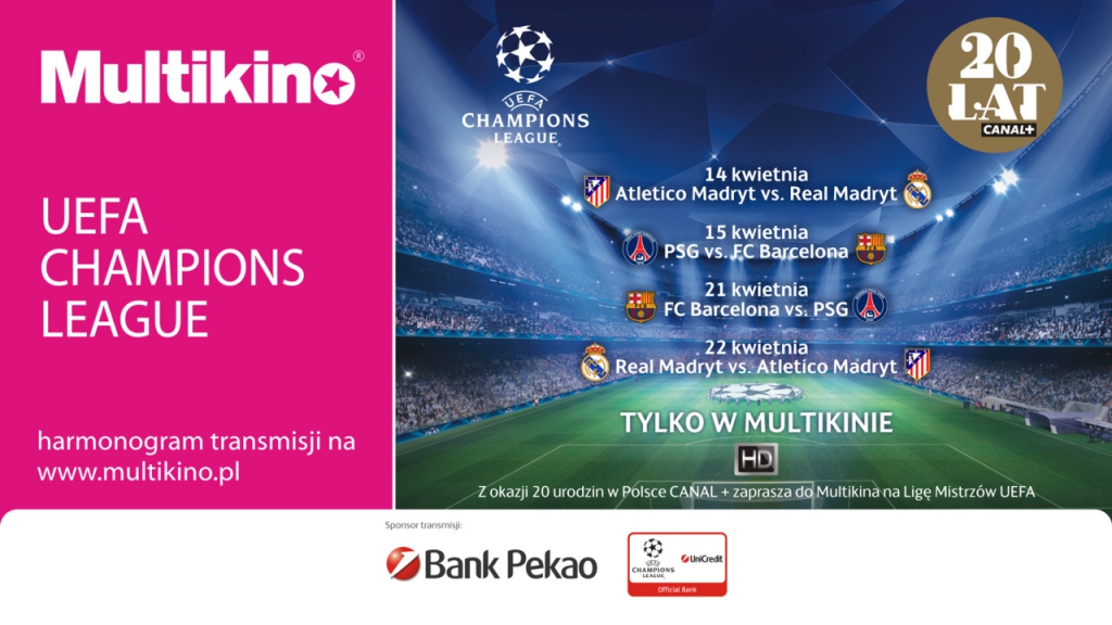 Multikino, znajdujące się w ofercie Multikino Media udostępnia swoje ekrany do transmisji meczów i stwarza możliwość doznania niezapomnianych wrażeń sportowych polskim kibicom UEFA Champions League. Podobnie jak rok temu będą oni mogli zobaczyć wszystkie mecze rozpoczynając od 1/8 finału Ligi Mistrzów w jakości High Definition.