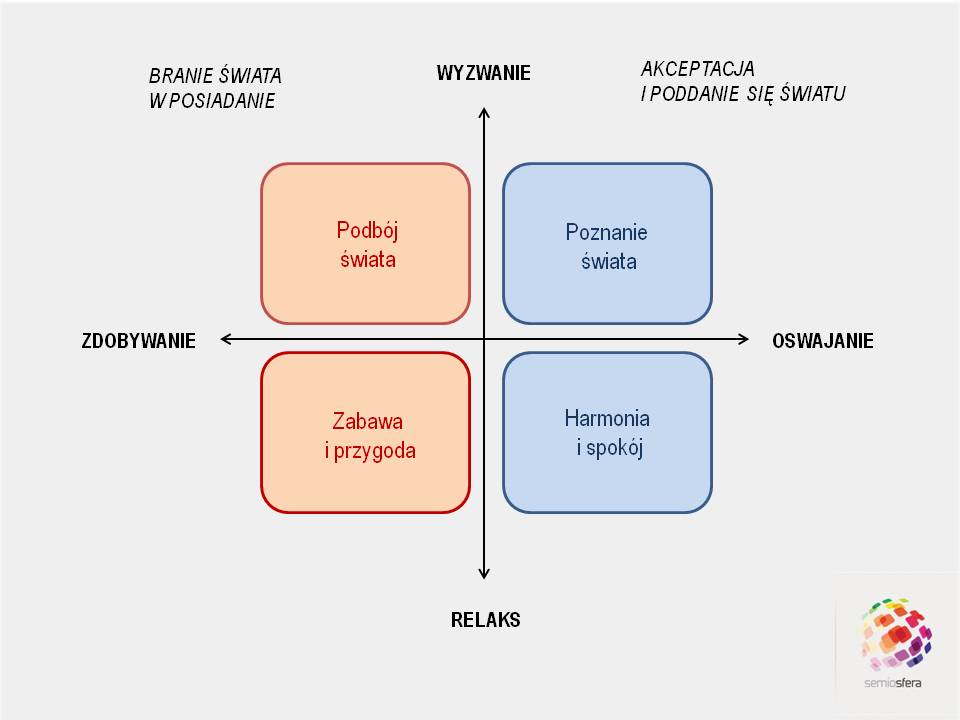 Każda z tych przestrzeni może służyć do definiowania kluczowych wartości i znaczeń dla marki, zwłaszcza jeśli, jak w wypadku linii lotniczych czy touroperatorów, sprzedajemy sposób na przemieszczanie się czy spędzanie czasu wolnego. Marka może koncentrować się na budowaniu swojego przekazu w sposób spójny i konsekwentny, wiedząc jednocześnie jakie znaczenia komunikuje w danym momencie. Jakich znaczeń zupełnie nie powinna używać ze względu na to, że są opozycyjne lub sprzeczne z tym, co chce powiedzieć. Marka jest w stanie określić jak jej komunikat ma się w stosunku do znaczeń komunikowanych przez konkurencję. Uzyskuje precyzyjną odpowiedź na pytanie – co w kulturze jest interesujące z perspektywy tak lub inaczej rozumianego znaczenia podróży. Co powinna zrobić, aby w sposób stały i trwały odświeżać swój wizerunek w oparciu o treści najbardziej przystające do aktualnie pożądanych przez kulturę. Możliwe są również zupełnie inne scenariusze działań – np. dywersyfikacja ofert szczegółowych przez łączenie ich z poszczególnymi obszarami znaczeniowymi rozłożonymi na całym kwadracie. Możliwości jest wiele, a wiedza o tym gdzie jesteśmy, kim chcemy być i jak to zrobić, żeby się tam znaleźć nie jest przypadkowa, ale wynika z kulturowych wzorców i obrazów, w które wszyscy jesteśmy wyposażeni.