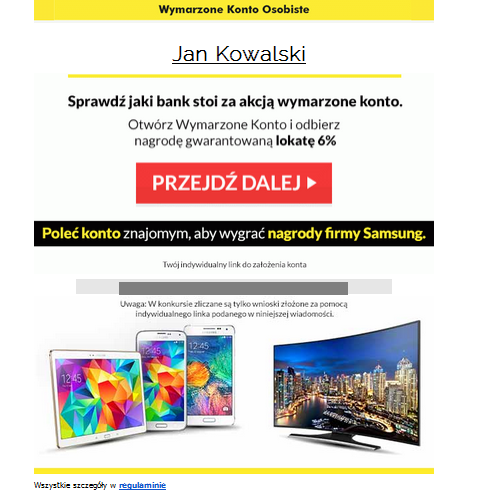 Następnym krokiem było poinformowanie użytkowników jaki Bank stoi za akcją „Ułóż sobie wymarzone konto” i rozesłanie do nich mailingu z informacją, w jaki sposób mogą założyć „Wymarzone konto” i odebrać nagrodę gwarantowaną – lokatę 6%. Mailing był spersonalizowany i zawierał link do założenia konta i do polecania go znajomym.