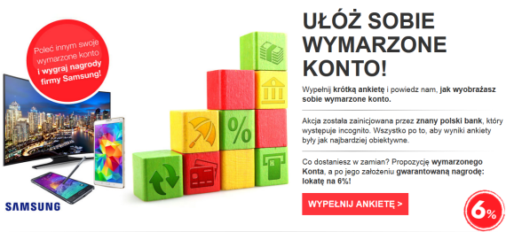Szeroka promocja akcji Banku, który pozostając incognito chciał poznać obiektywne opinie użytkowników na temat oczekiwań wobec ich Wymarzonego Konta. Dla uwiarygodnienia tej kampanii dołączono informację, że za wszystkim stoi znana instytucja bankowa. Nagrodą za wypełnienie ankiety była możliwość założenia „Wymarzonego konta” wraz z bonusem w postaci lokaty 6% w skali roku. Dodatkowo, za polecanie konta znajomym użytkownik mógł wziąć udział w konkursie z nagrodami produktów marki Samsung. Ankietę można było wypełnić na specjalnej stronie przez 2 tygodnie – od 16 do 28 lutego.