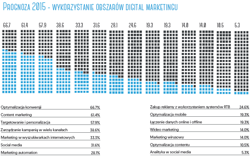 - W porównaniu do 2014 roku nastąpił gwałtowny wzrost zainteresowania content marketingiem (otrzymał o ponad 14 punktów procentowych więcej wskazań niż w poprzedniej edycji badania).