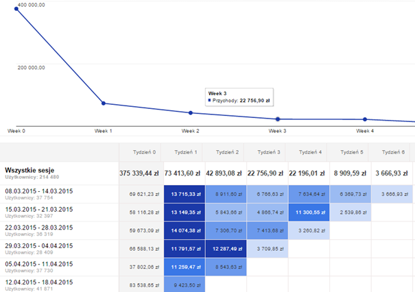 Przykładowo: użytkownicy pozyskani między 8 a 14 marca przynieśli ok 69 tys. przychodu w tygodniu pozyskania, ponad 13 tys. w tygodniu pierwszym, ponad 5 tys. w drugim, ponad 4 tys. w trzecim i tak dalej.