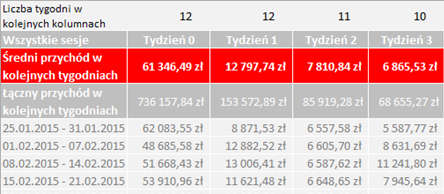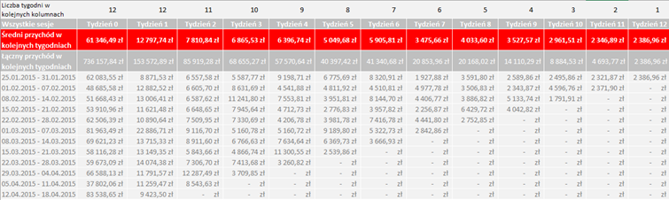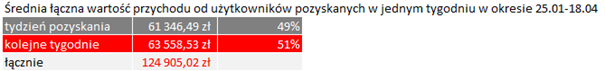 Co z tego wynika? Możemy wnioskować, że średnio grupa użytkowników pozyskana w jednym tygodniu jest warta w danym tygodniu ok. 61 tys. zł, a w kolejnych 12 tygodniach łącznie – jeszcze raz tyle.