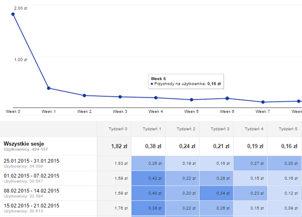 Kolor komórki wskazuje na jej wartość. Uwagę zwraca kohorta dla przedziału 29 marca – 4 kwietnia. Użytkownicy z tej grupy przynieśli znaczne przychody nie tylko w tygodniu pozyskania, ale i w dwóch kolejnych. Można sobie zdać pytanie, jakie działania lub jakie okoliczności wpłynęły na takie zachowanie (np. Wielkanoc).
