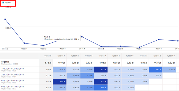 Wynika z niego, że użytkownik pozyskany z wyników organicznych jest wart średnio 2,72 zł w tygodniu pozyskania i kolejne 3,93 w kolejnych 9 tygodniach. W ciągu ponad dwóch miesięcy użytkownicy zwiększają swoją wartość średnio o ponad 140 proc. i łącznie, średnio jeden użytkownik jest wart 6,65 zł.