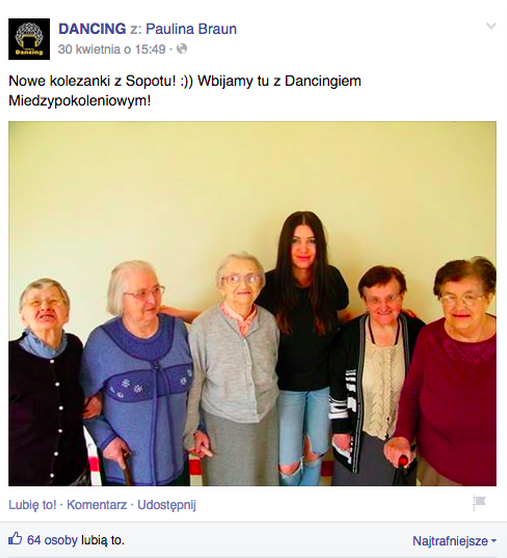 W związku z tymi zmianami powstaje coraz więcej inicjatyw mających na celu aktywizację seniorów. Doskonałym przykładem takiej akcji są Dancingi międzypokoleniowe organizowane przez Paulinę Braun.