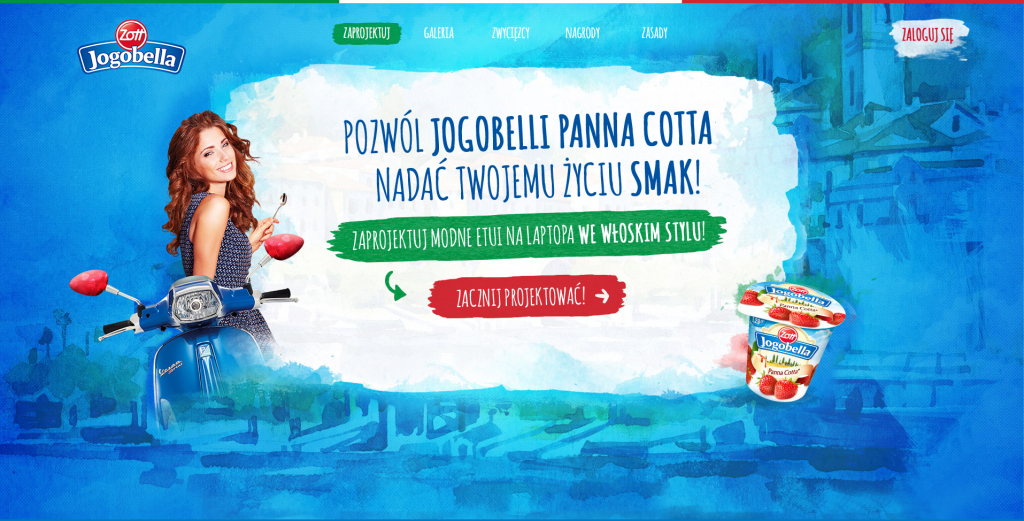 Jogobella Panna Cotta zachęca i inspiruje swoje konsumentki do zaprojektowania własnego wyjątkowego etui na laptopa na wzór włoskich atelier mody. Kreator dostępny jest na stronie www.jogobella.pl. Najbardziej kreatywne projekty będą realizowane – co tydzień wybrani uczestnicy otrzymają zaprojektowane przez siebie etui, każdy dostanie także kod VOD na film „Zakochani w Rzymie”, a na koniec zabawy zostanie wręczona nagroda główna: skuter Vespa.
