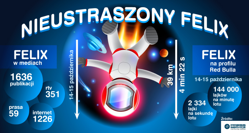 Z zastraszającą szybkością przybywało również „lajków” na facebookowym fan page’u Red Bull Stratos. Każda sekunda lotu Austriaka wygenerowała 2 334 podniesionych kciuków. Infografikę podsumowującą przedsięwzięcie przygotował Press-Service:
