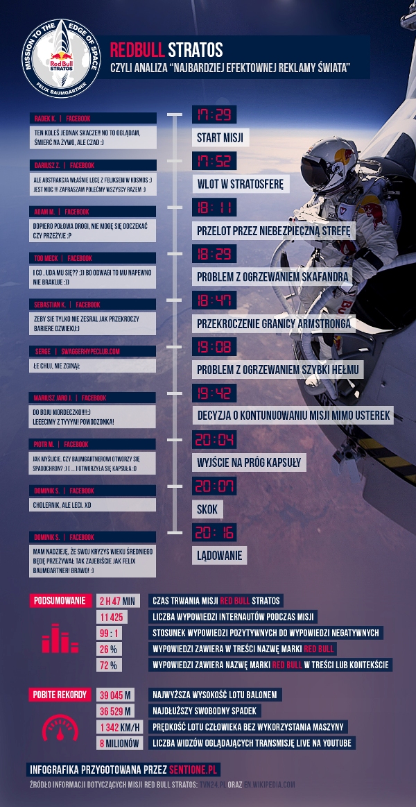 W temacie rekordowego skoku Felixa Baumgartnera w ramach projektu Red Bull Stratos, w kontekście oceny marketingowo biznesowej, napisano już chyba wszystko. Wiemy już, że miliony oglądały skok (na żywo i w internecie). Wiemy, że owe 50 mln $ wydane ponoć na projekt w ciągu 5 lat, absolutnie nie jest kwotą kosmiczną w kontekście potencjalnego ROI, wartości ekwiwalentu mediowego, jaki osiągnięto, czy buzzu w social mediach, który jeszcze długo będzie się liczył.