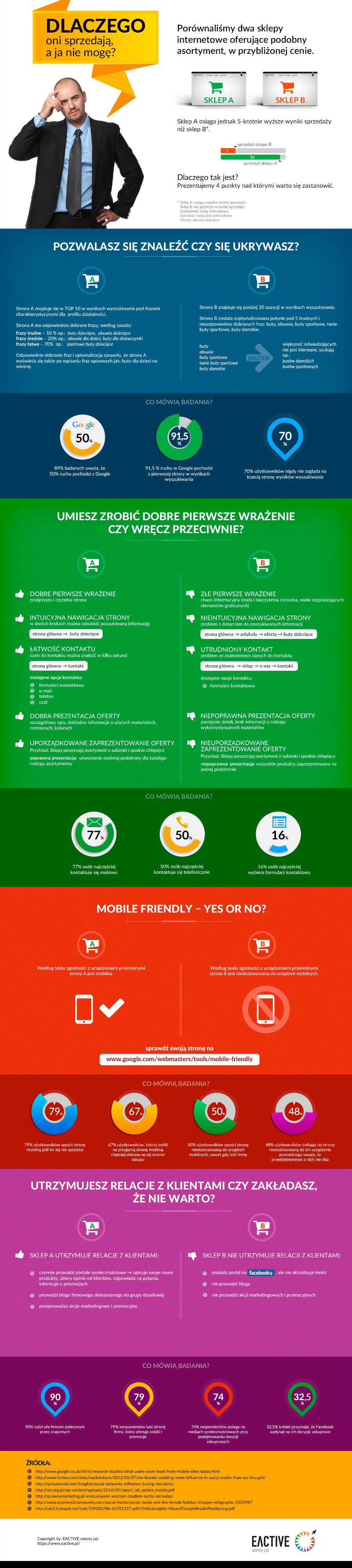 Poniższa infografika odpowiada na wiele pytań nurtujących przedsiębiorców, przede wszystkim na jedno główne: „Dlaczego oni sprzedają, a ja nie mogę?” Zachęcamy wszystkich do zapoznania się z infografiką – pozwoli ona zrozumieć aspekty warunkujące sprzedaż w internecie. Liczymy, że ta dawka inspiracji będzie pierwszym krokiem ku zmianom na lepsze w Twoim biznesie.